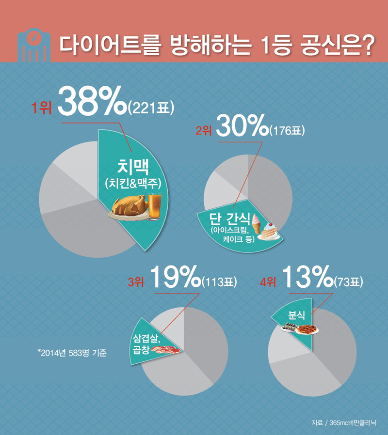 365mc 비만클리닉(이하 365mc)은 지난 6월부터 7월까지 내원 고객 583명을 대상으로 ‘다이어트 방해하는 음식’에 관한 설문조사를 실시했다.